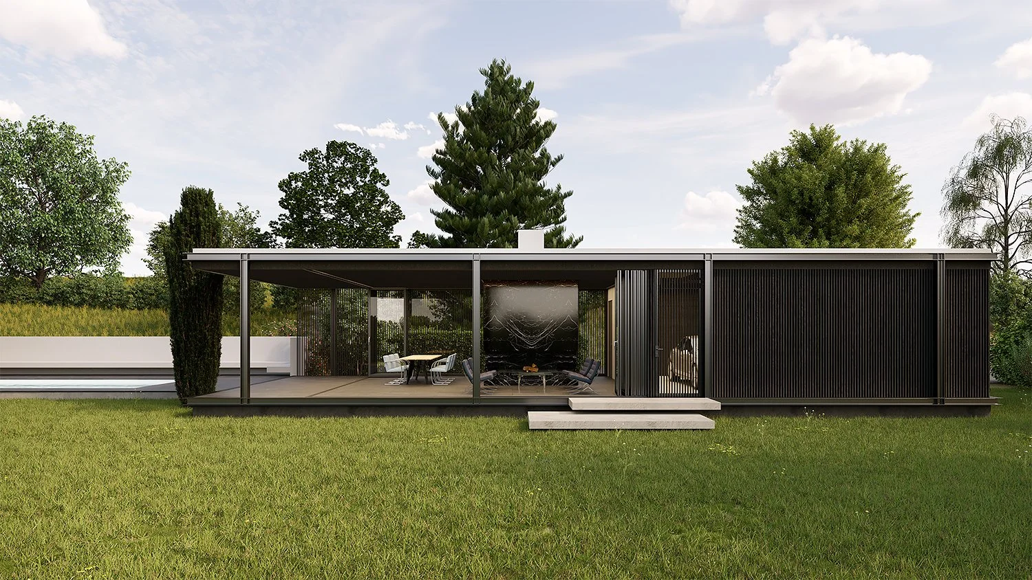 PANORAMAHOUSE 006 ist ein Gästepavillon in Zürich mit Blick auf den üppigen Garten und den Pool, der mit dem Haupthaus verbunden ist. Es verfügt über einen großen, flexiblen Wohnbereich zum Verweilen, Essen und Bewirten, ein Badezimmer, eine Küche, einen Kamin und einen Grill, eine Garage für 2 Autos, ein 130 m2 großes Solardach und einen 65 m2 großen Innenraum.